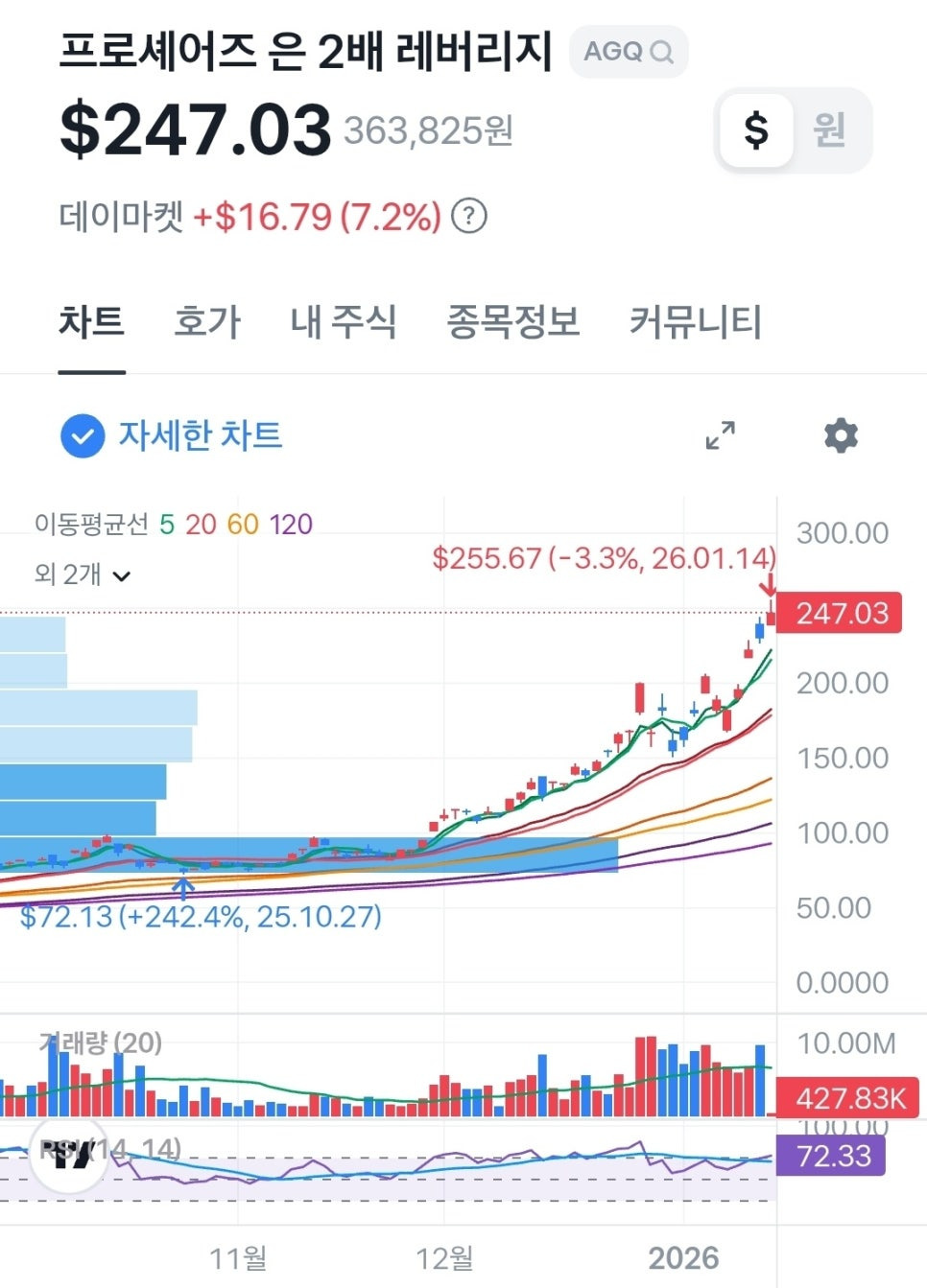 26.01.14 오후3시50분 현재 AGQ 은 2배 레버리지 가격은