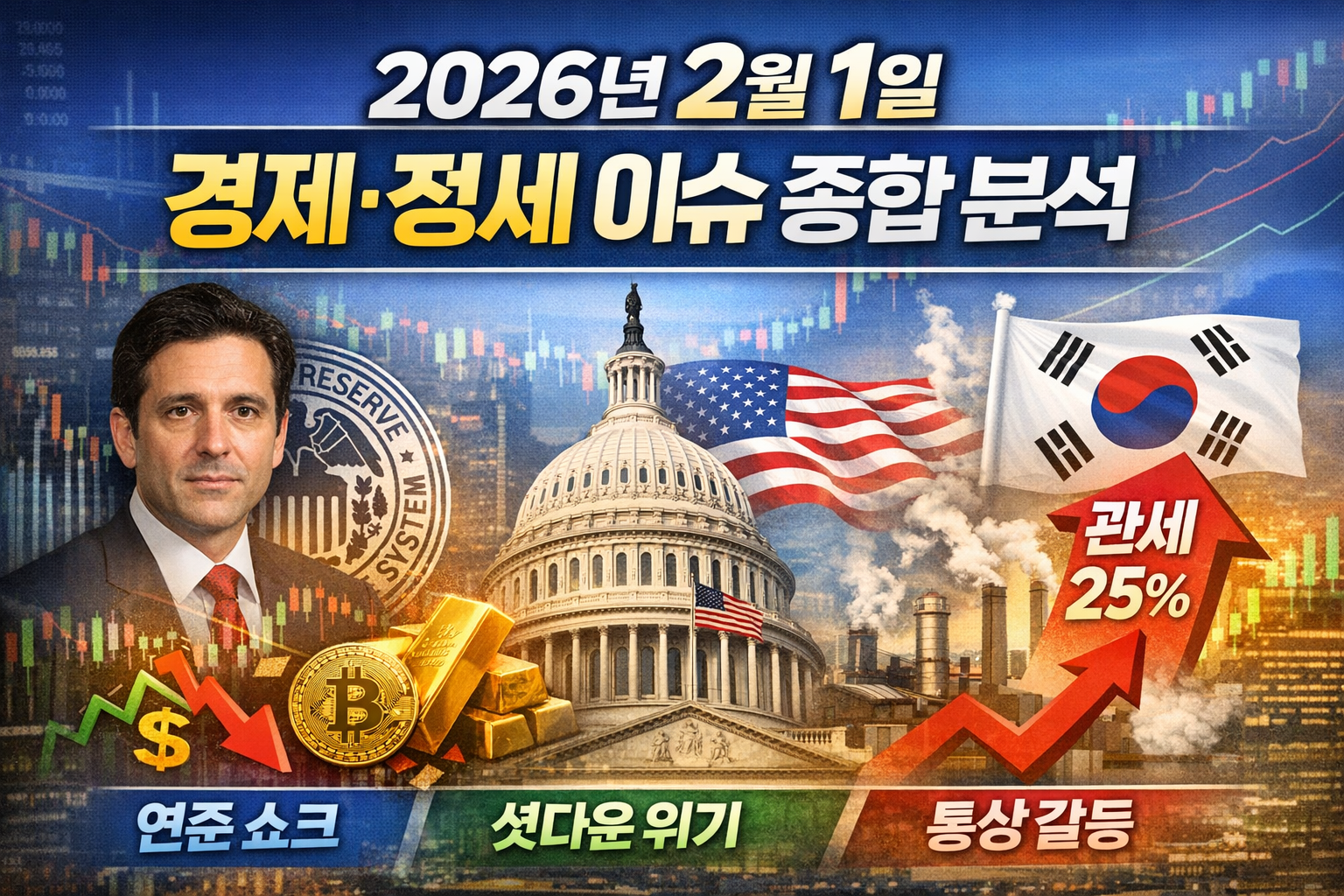 트럼프 대통령의 케빈 워시 연준 의장 지명은 강달러와 고금리 장기화 기대를 자극하며 금·은·암호화폐 등 위험자산의 동반 조정을 촉발했다. 동시에 한국에는 관세 25% 재인상 위협이 현실화되며 수출주와 환율에 부담으로 작용하고 있다.